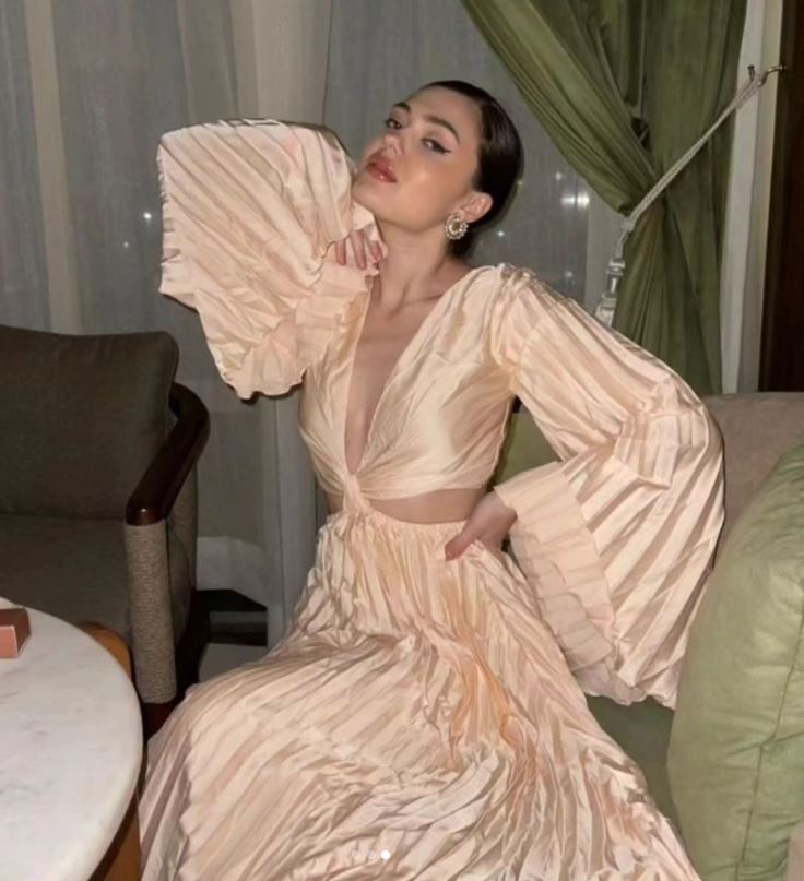 Introducing the Celestial Allure Dress- the perfect dress born to make you have the main character energy. Made of fine satin pleated fabric, this eye-catching dress features a flowy silhouette and our signature cut out waist, ensuring you stand out from the crowd. A must-have for those looking to make a statement with style.
