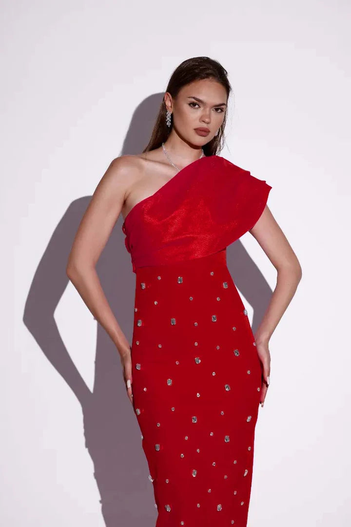 the ultimate “it girl” dress for unforgettable glam evenings. This full-length stunner features a dramatic one-shoulder organza detail that effortlessly elevates its chic silhouette. Adorned with premium rhinestone embellishments, every inch of this dress is designed to dazzle and captivate.
