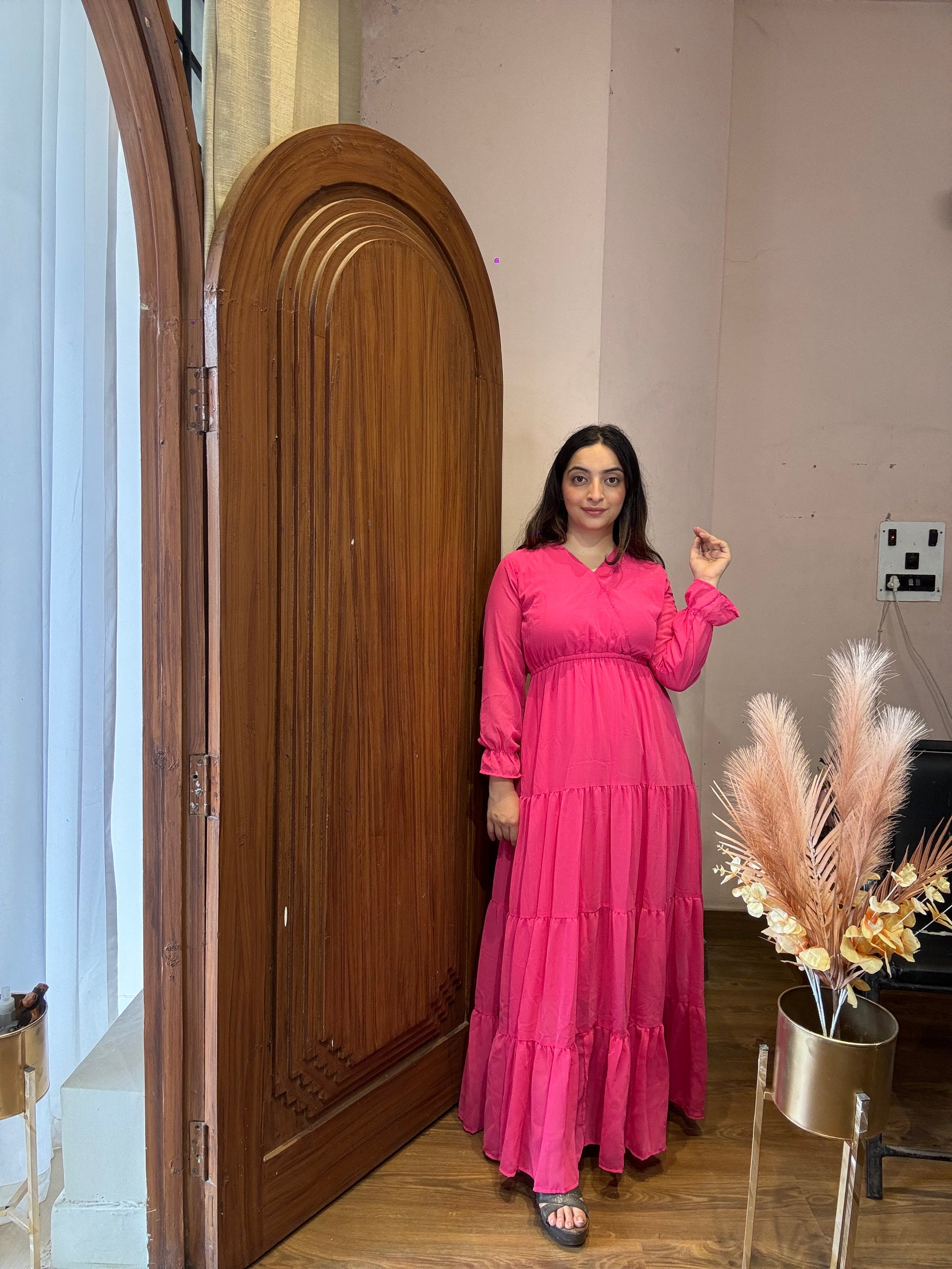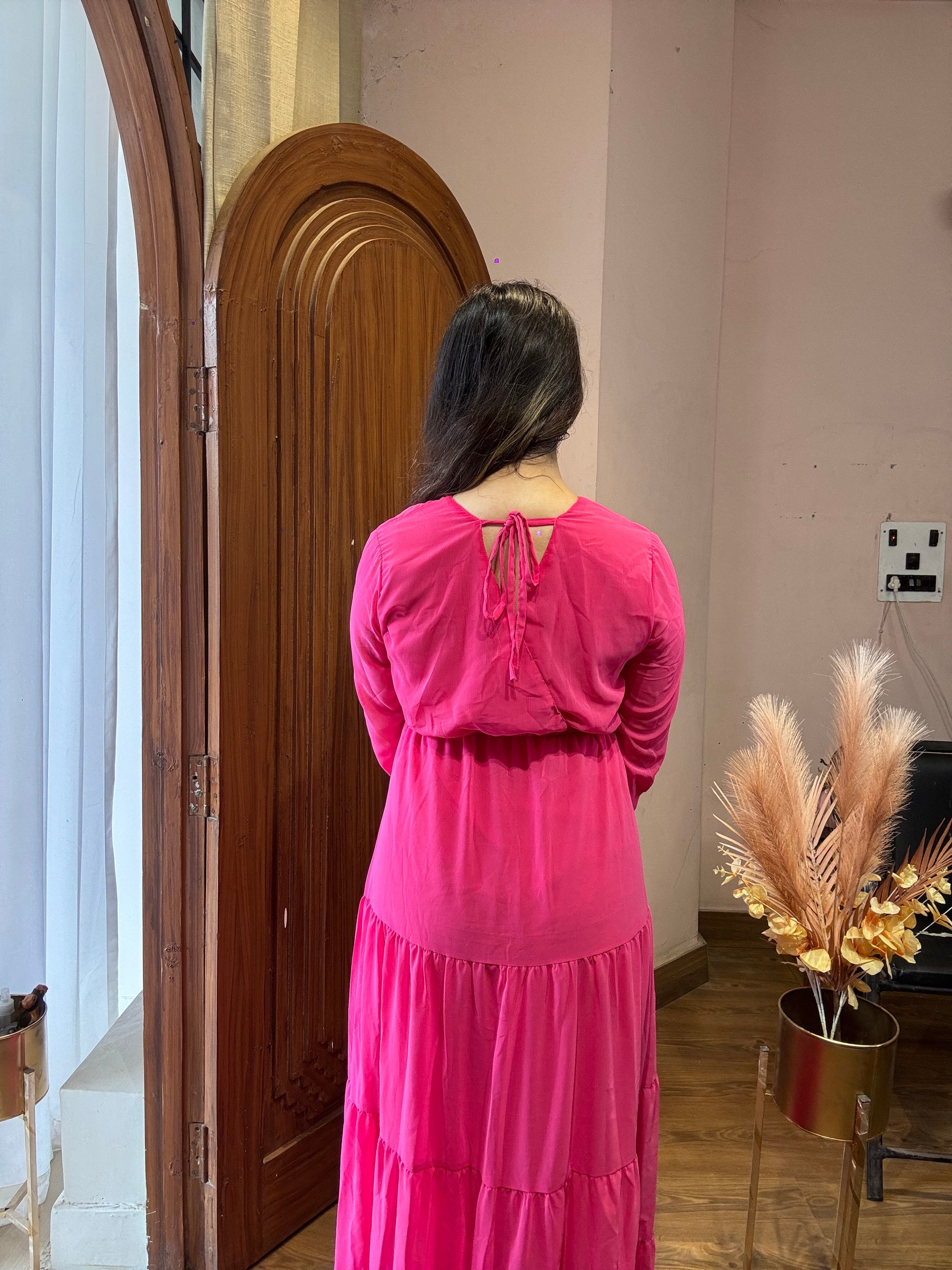 Get ready to flow through your day in style with our solid maxi dress. Made from luxurious georgette fabric, this dress features a v-neckline with a unique tie-up detail at the back. Perfect for any casual getaway, this dress will have you looking effortlessly chic and ready for anything.