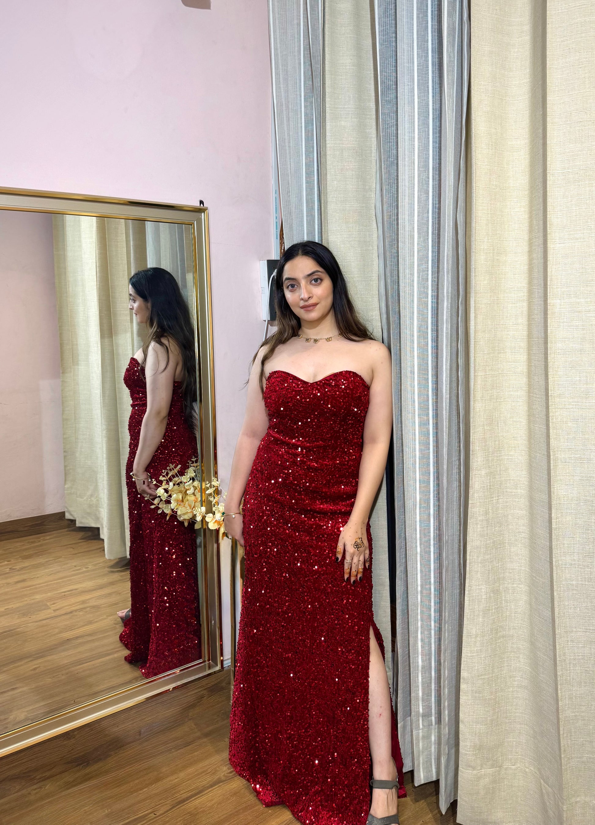 The sleek tube design accentuates your silhouette, while the rich maroon color exudes sophistication and elegance. Whether you’re attending a Gala, a Romantic Evening, or a chic celebration, this statement piece ensures all eyes are on you.