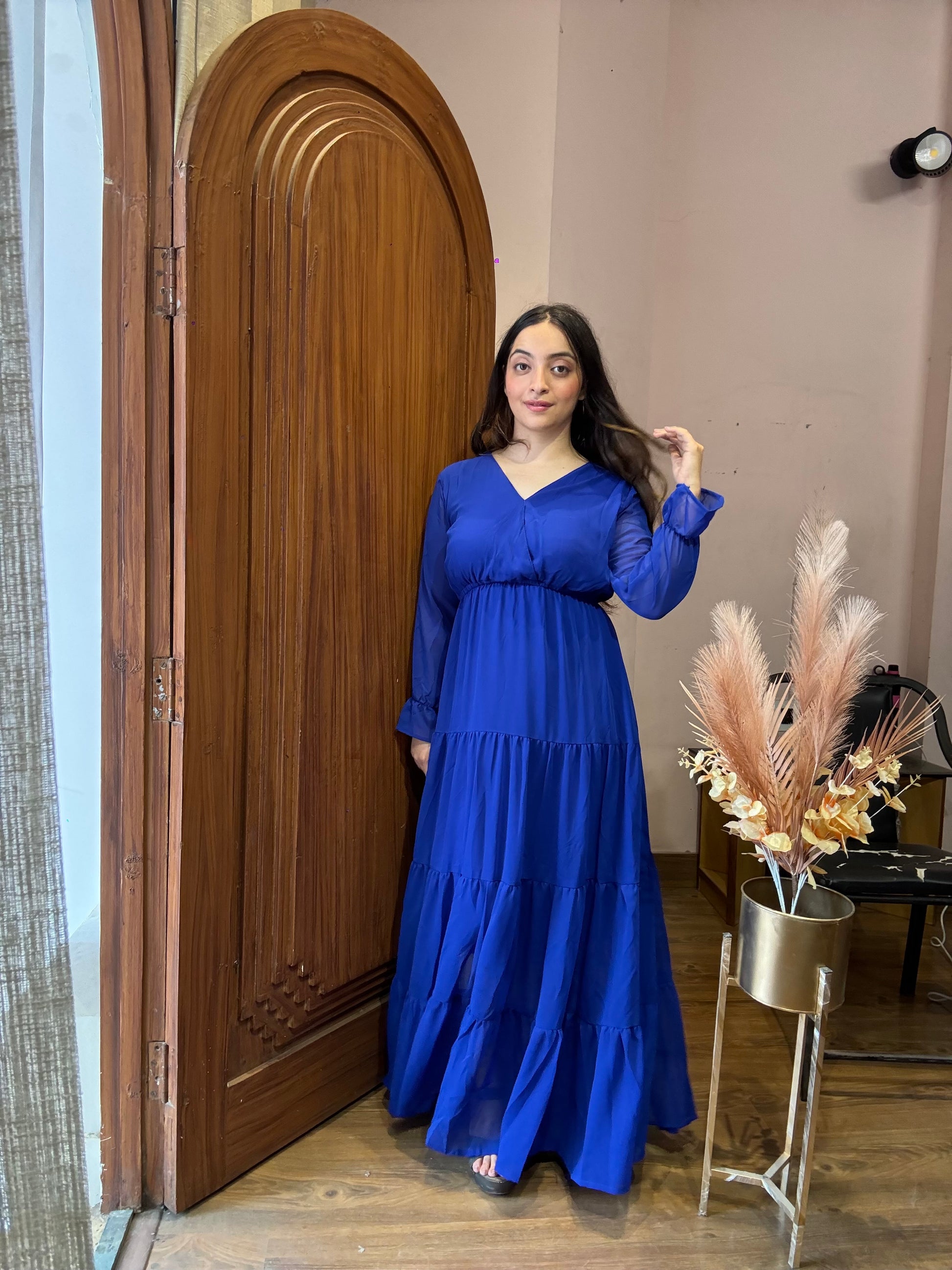 Get ready to flow through your day in style with our solid maxi dress. Made from luxurious georgette fabric, this dress features a v-neckline with a unique tie-up detail at the back. Perfect for any casual getaway, this dress will have you looking effortlessly chic and ready for anything.