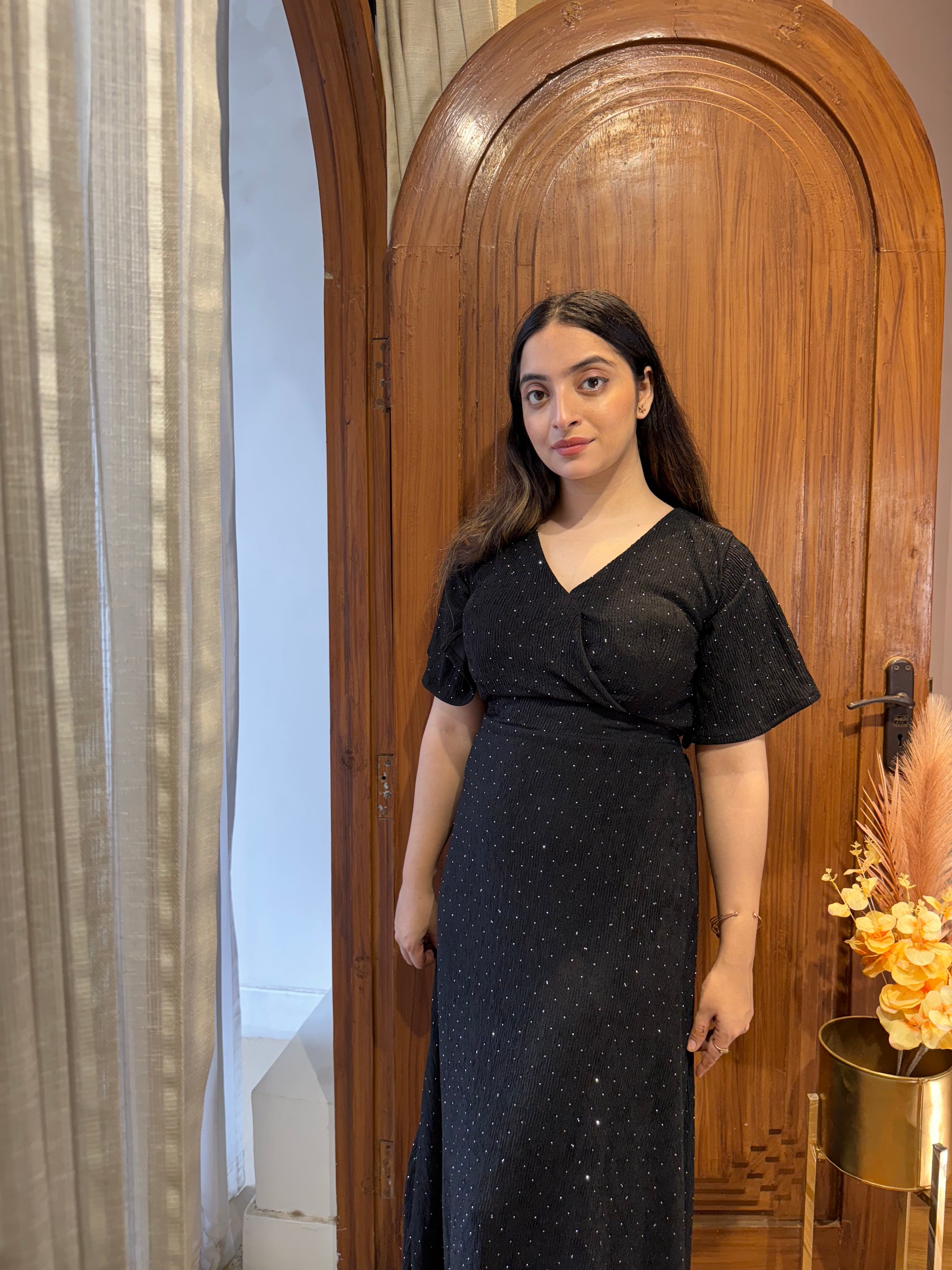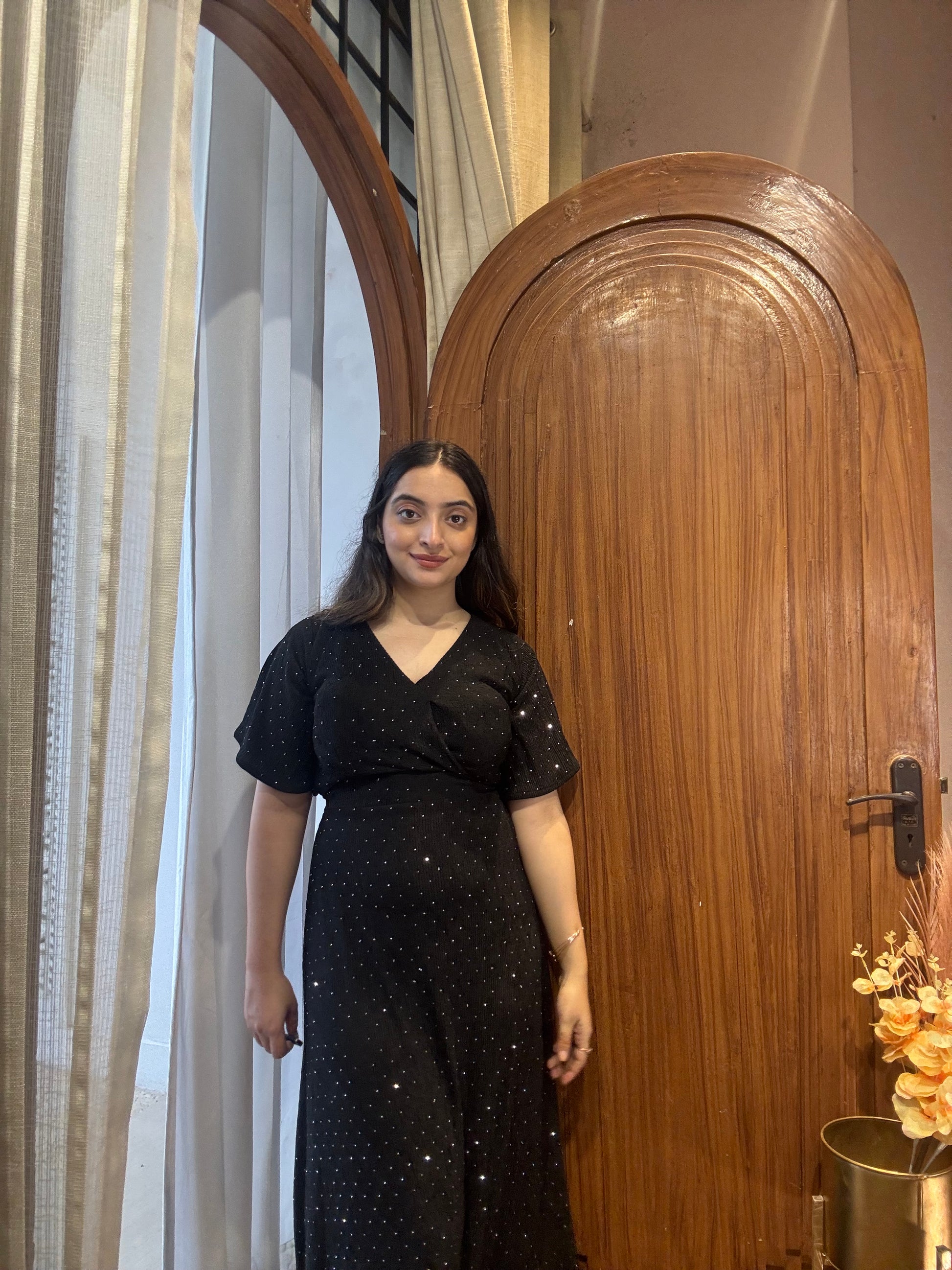 The Glimmer Dress features luxurious faux Swarovski fabric with a soft, stretchable textured finish for comfort and style. Its elegant V-neck and relaxed sleeves create a sophisticated silhouette, lightly padded bust, while the back zip closure and adjustable tie waist ensure a perfect fit. This effortlessly chic dress is ideal for formal occasions and office parties, combining ease of wear with polished appeal.